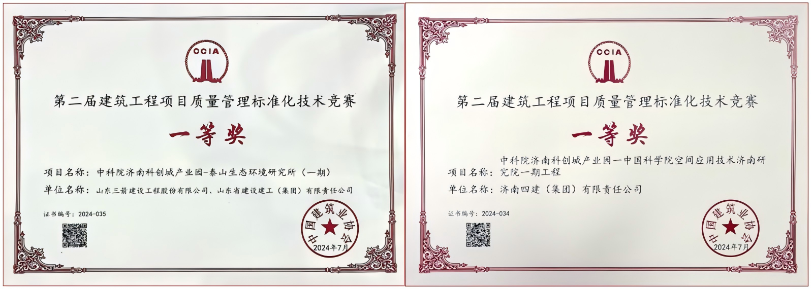 空天信息大学及中博谦崇云境作为集团典型标杆建设项目,同时荣获本项活动竞赛奖,是继集团所属济南四建承建泉逸雅苑项目、中科院济南科创城产业园—中国科学院空间应用技术济南研究院项目及山东三箭承建中科院济南科创城产业园—泰山生态环境研究所项目获得的三个一等奖后,又一次成功实践。其中集团所属济南四建已实现本项赛事“三连冠”,充分展现了集团在质量管理领域的优良传统。